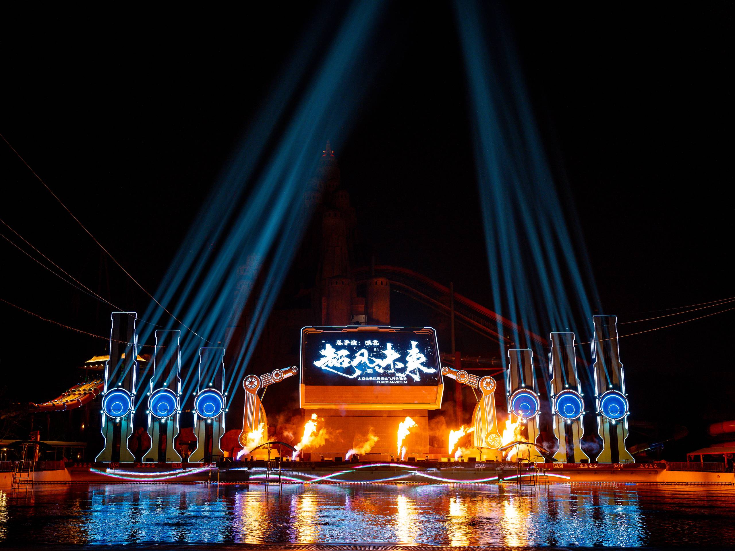 近萬平方米的「瑪雅海灘」、無邊際泳池、400米叢林秘境漂流之旅等9大親水體驗空間可供親水打卡;園內表演豐富多元,有熱辣奔放的巴西桑巴,青春動感的水花派對,還有激情翻騰的水上飛人。此外,還設置了六台大型水炮穹頂型地籠罩整個海灘,通過日照製造出限時版的彩虹時刻。在晚間,光影秀《超凡未來》突破傳統舞台空間的限制,在水上打造了單體懸浮式360°旋轉飛行舞台,集裸眼3D、火效和燈光於一體,打造視聽盛宴。