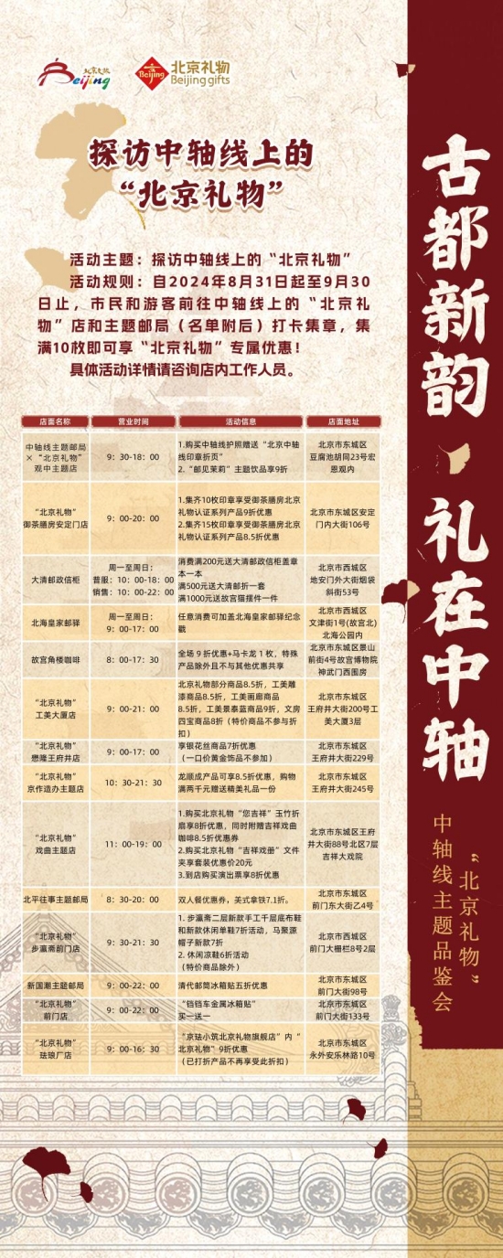活動精心設計了15枚中軸線主題印章,分別放置在14家「北京禮物」主題店和主題郵局中,8月31日至9月30日期間,市民和遊客到店集齊任意10款印章即可享受「北京禮物」的專屬優惠。