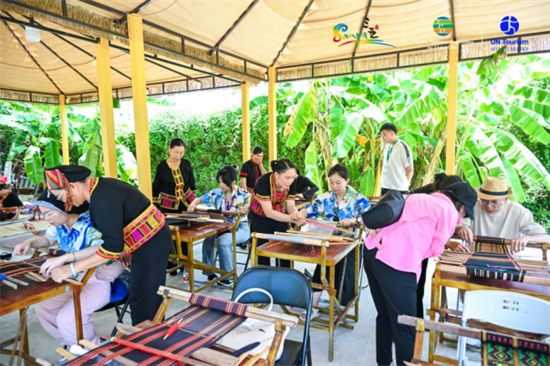 嘉賓們體驗黎錦紡織技藝