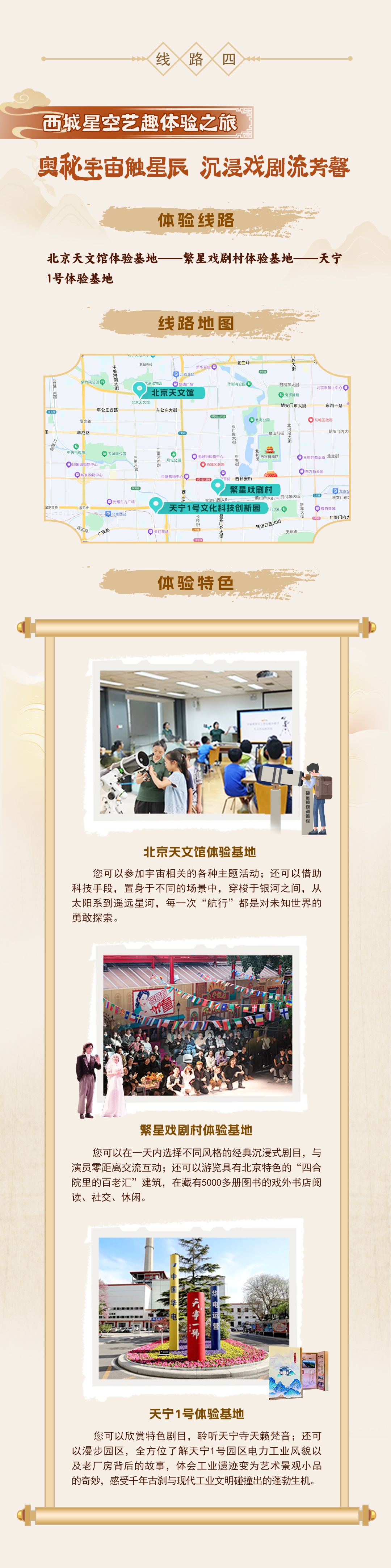 來東城赴一場京味兒之旅,體驗木作、點藍等非遺技藝,穿戴京劇服裝道具,觀摩戲曲演員化妝,在仿古的衚衕街道體驗拉洋片;漫步西城的衚衕小道,喝「老二分」大碗茶,觀看京劇、曲藝等傳統表演,學做一雙正宗的老北京布鞋,漫步式VR沉浸體驗「中軸奇妙夜」、「奇遇山海經」,或欣賞經典沉浸戲劇,打卡具有北京特色的「四合院裏的百老匯」建築;踏入朝陽,觀看經典木偶戲演出和體驗木偶手工課程,欣賞國內外藝術大師作品展,探秘電影的拍攝流程,體驗紫檀雕刻、金漆鑲嵌、貼金等傳統技藝,感受多元藝術和匠心古韻的魅力;走進海淀,觀看京西皮影戲、製作皮影人,聆聽一場學術講座,汲取藝術與智慧的甘泉;到豐台赴一場與花的約定,賞花、栽花、喂鸚鵡、製作園林模型,在千姿百態的園林裏享受片刻的寧靜。
