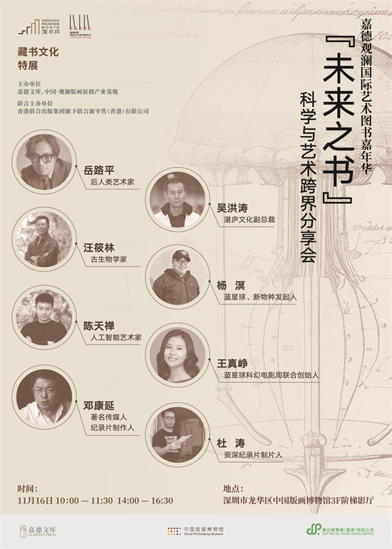 中國文聯全委會委員、中國美協理事、廣東省文聯副主席、 廣東省美協副主席梁宇先生,深圳市龍華區委常委、宣傳部部長黃立敏女士,深圳市龍華區文化廣電旅遊體育局黨組書記、局長趙廣銳先生,以及嘉德投資控股有限公司董事總裁、嘉德藝術中心總經理寇勤先生,生活·讀書·新知三聯書店原總編輯、嘉德文庫顧問李昕先生,著名藝術家、中央美術學院造型學院版畫繫教授康劍飛先生,香港三聯書店設計總監吳冠曼女士,聯合新零售商品採購與運營部總監劉美兒女士,聯合新零售一本讀書會項目負責人鄭喻心女士,商務印書館涵芬樓書店李志萍女士,嘉德投資控股有限公司助理總裁兼嘉德文庫主編、總經理楊涓女士,新華網未來研究院院長、藍星球科幻電影周創始人楊溟先生,藍星球科幻電影周聯合創始人王真崢女士和國內外藝術家參加活動。
