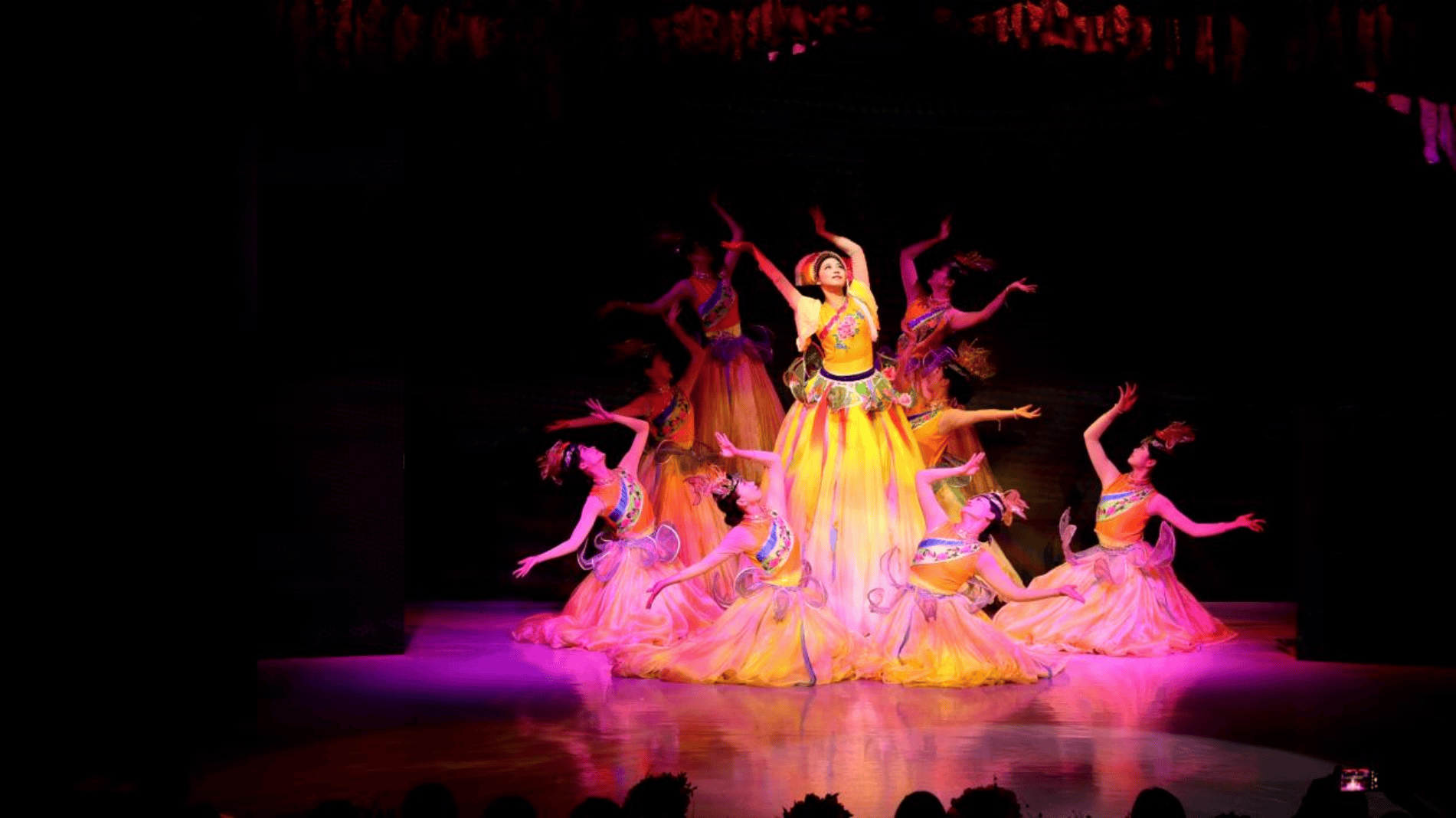 洞中有華麗的演齣劇場,近半個小時的歌舞表演,讓我們對金梭島居民的生活和愛情有進一步了解,正如在白族文化中,對女士稱呼為「金花」,男士稱呼為「阿鵬」。1959年電影《五朵金花》,是一部關於雲南大理風光及白族青年幸福相愛的經典,可以說影響了好幾代人,我也是最早從這部電影嚮往大理的。