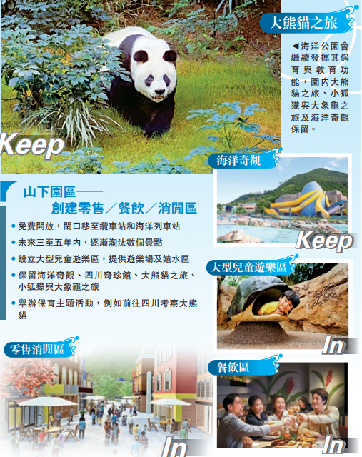 海洋公園的定位,一直跟保育和教育息息相關。新方案之下,海洋奇觀、大熊貓之旅及去年新建的小狐獴與大象龜之旅,將連同即將竣工的STEAM教育中心,繼續發揮其相關功能,並會跟其他保育機構合作,例如香港濕地公園等,舉辦主題活動。