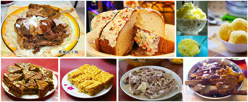 塔城各民族相互交融,形成了多元的民族飲食文化。在這裏,每個民族都有各自的特色美食,塔塔爾族的糕點、俄羅斯族的「瑪洛什」、格瓦斯,哈薩克族的那仁,還有讓人難以忘懷的塔城風乾肉、塔城飛鵝。尤其是塔城各民族的特色糕點,不但種類豐富,而且以其獨特的味道、配料和做法,成為塔城各民族餐桌上和宴請賓客時必備的美味佳餚,也是全國各地旅遊者來塔城必買的特色商品之一。