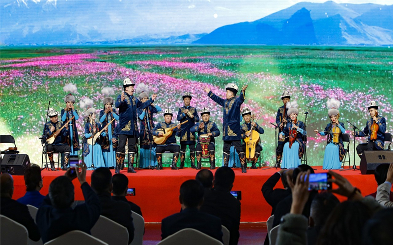 14日,在新疆美術館,新疆是個好地方——對口援疆19省市非物質文化遺產展開幕。圖為文藝工作者在表演節目。石榴雲新疆日報記者 謝龍 攝