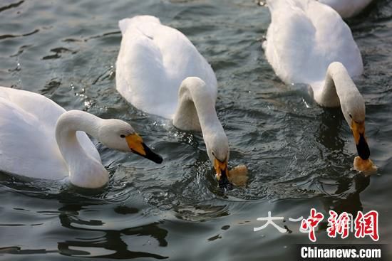 中新網烏魯木齊12月7日電(王陸斌 師羌生)12月6日,雪後的新疆庫爾勒市天空晴朗,庫爾勒市市園林工作人員冒着嚴寒到孔雀河和杜鵑河投饢餵食天鵝。