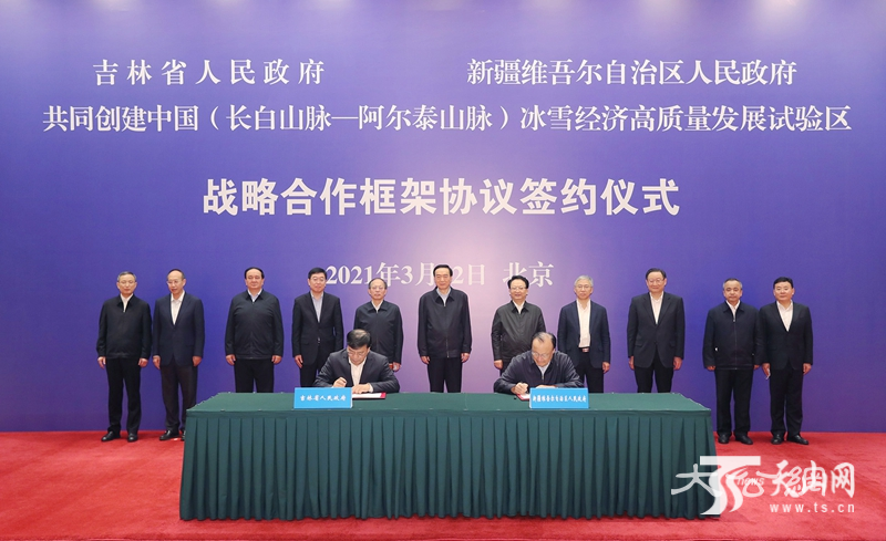 3月12日上午,新疆、吉林兩省區在北京簽署共同創建中國(長白山脈—阿爾泰山脈)冰雪經濟高質量發展試驗區戰略合作框架協議,抓住用好舉辦2022年北京冬奧會和冬殘奧會的歷史機遇,發揮對口援疆優勢作用,推動區域冰雪產業提檔升級和規模集聚發展。