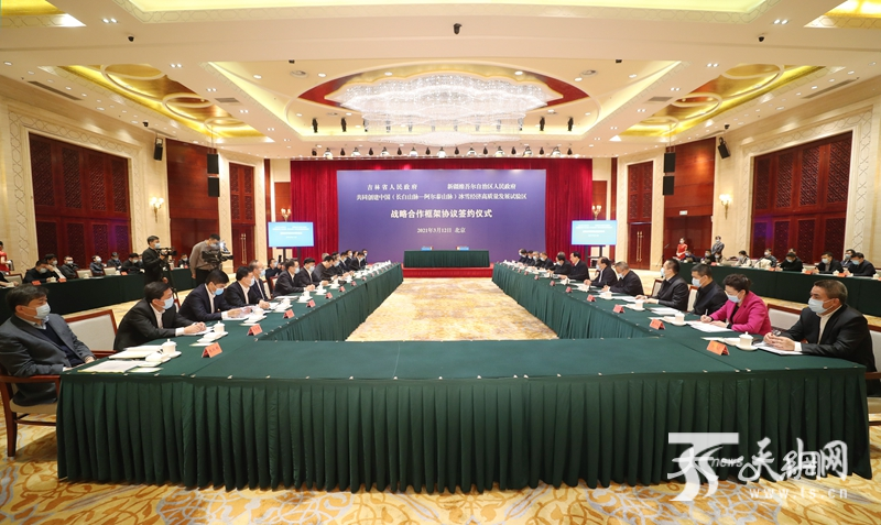 3月12日,新疆維吾爾自治區人民政府和吉林省人民政府簽訂戰略合作框架協議,共同創建中國(長白山脈—阿爾泰山脈)冰雪經濟高質量發展試驗區。圖為簽約儀式現場。崔志堅攝