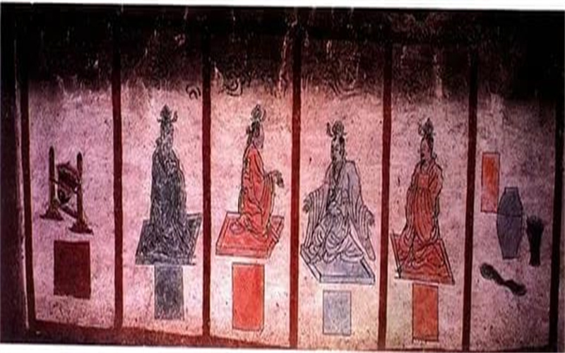 六屏式鑒戒圖,全長4米,高度為1.54米,時代為唐代。這是一幅將倫理說教融于書畫的六屏式墓室壁畫,畫面中用深紅色的闊筆分隔出六個屏框,每屏都繪有圖案,或人或物。圖中的男子都身着闊袖長袍,頭戴花形冠。自左向右依次繪有欹器、玉人、金人、石人、木人,以及撲滿、生芻(青草)和素絲。