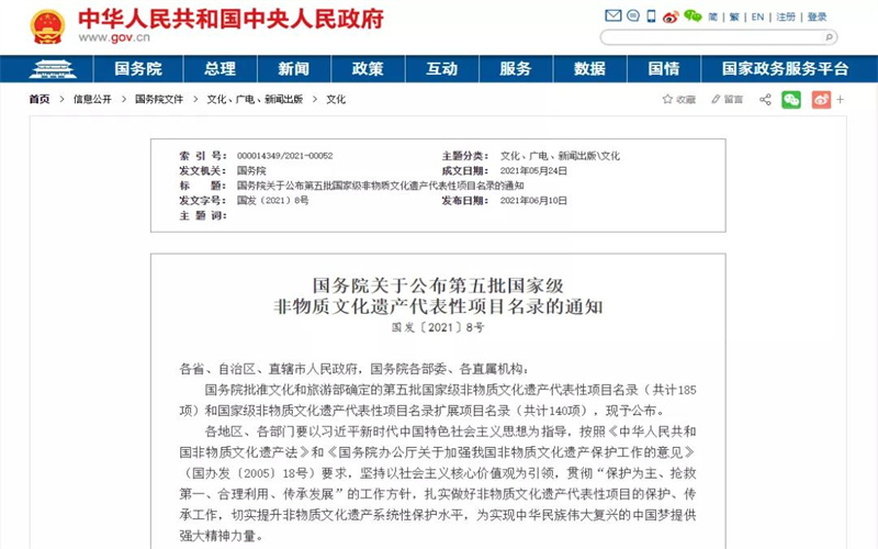 6月10日,國務院發布《關于公布第五批國家級非物質文化遺產代表性項目名錄的通知》,公布了第五批國家級非物質文化遺產代表性項目名錄185項,以及國家級非物質文化遺產代表性項目名錄擴展項目名錄140項,其中新疆有14項入選。