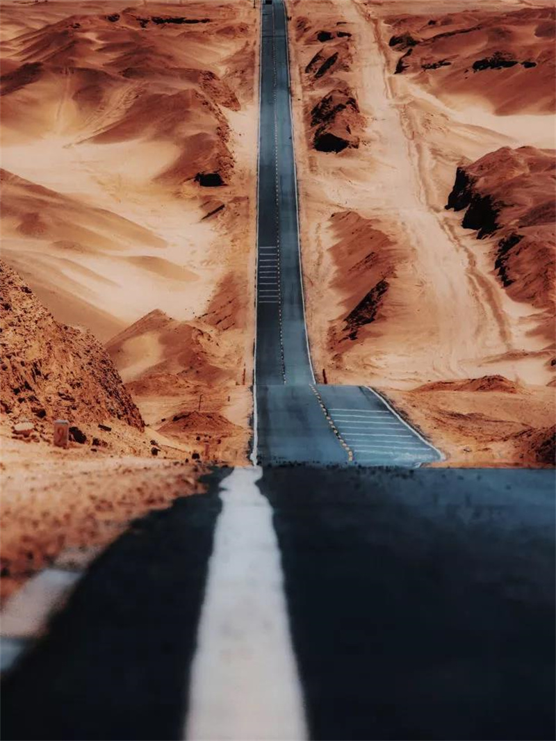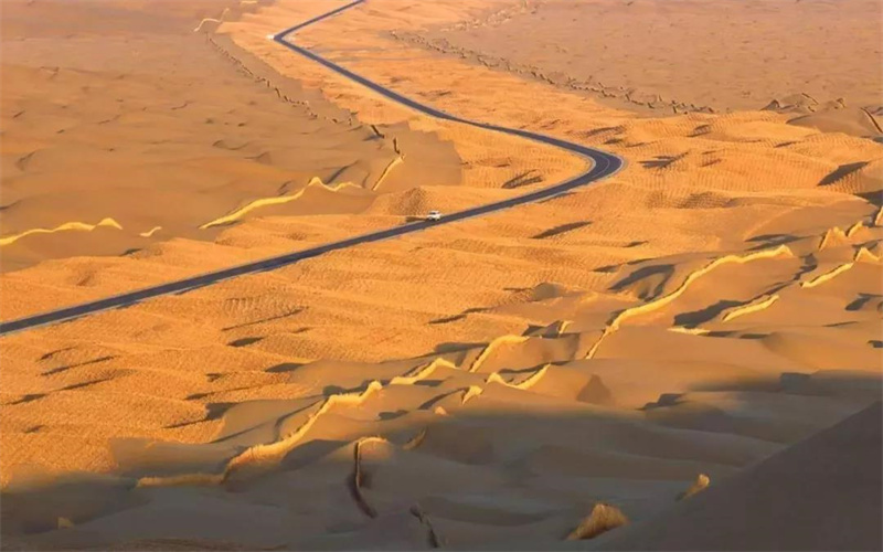 從空中望去,這條公路,像一條鑲着墨綠色邊兒的黑色「絲帶」。綿延的植被,在沙海中不斷向前又向前。