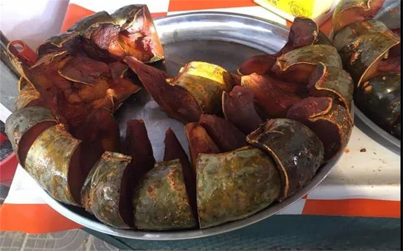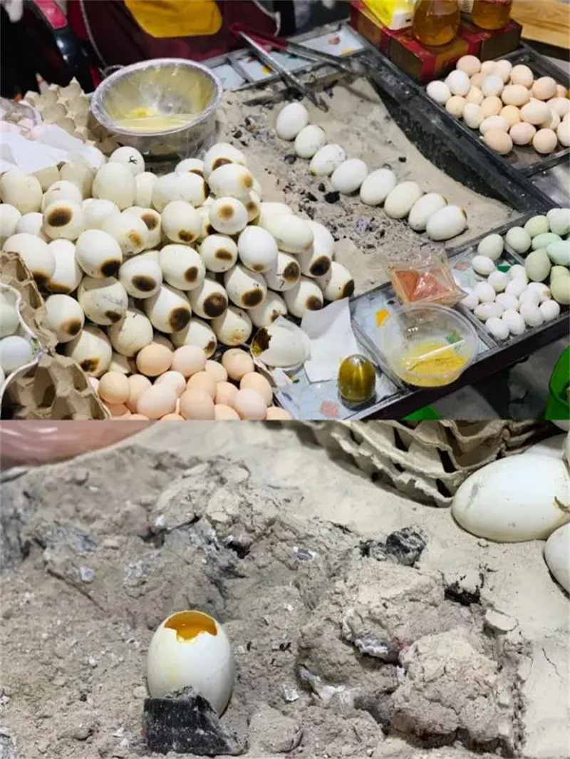 雞蛋和鴿子蛋是完整烤的,烤好後再撒點兒鹽和孜然,保持了原汁原味。而最受歡迎的鵝蛋,則是在新鮮的蛋上開一個小孔,倒出部分蛋清,加入18種調料以後烤製而成,吃起來有點像糯米,淡淡的糊味兒夾雜着甜香。