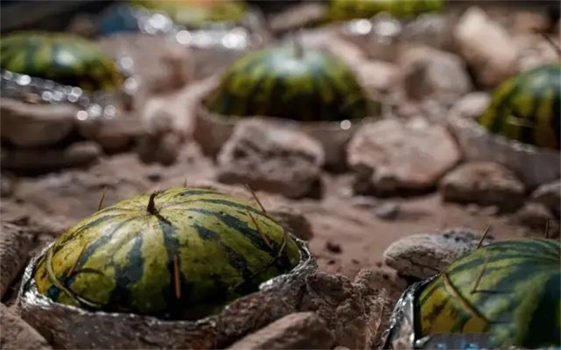 就是把羊肉放到掏空西瓜瓤的西瓜裏烤。一般選三四公斤重的西瓜,切開一個蓋子,把裏面的瓜瓤掏出來,放上腌制好的羊肉,最後蓋上西瓜蓋子,用專用的架子掛到饢坑裡烤三四個小時。
