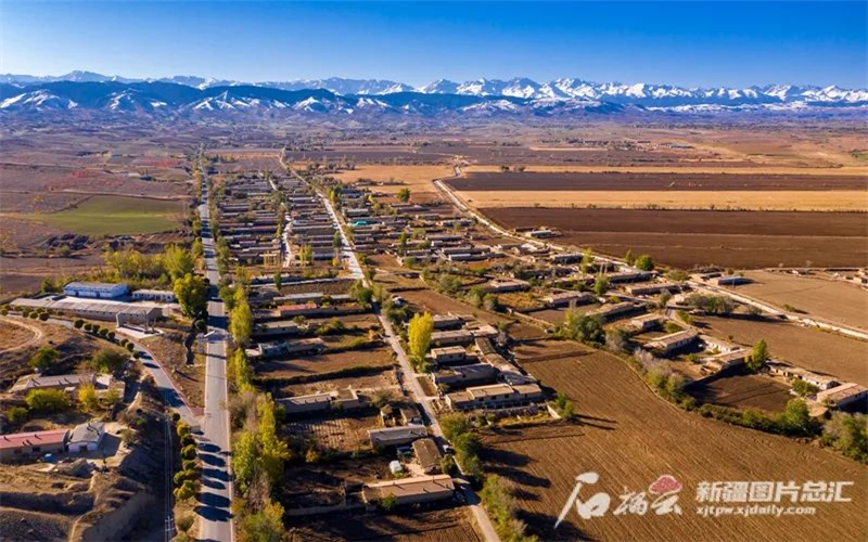 木壘哈薩克自治縣英格堡鄉月亮地村(無人機航拍資料圖)。石榴雲/新疆日報記者 陽光 攝