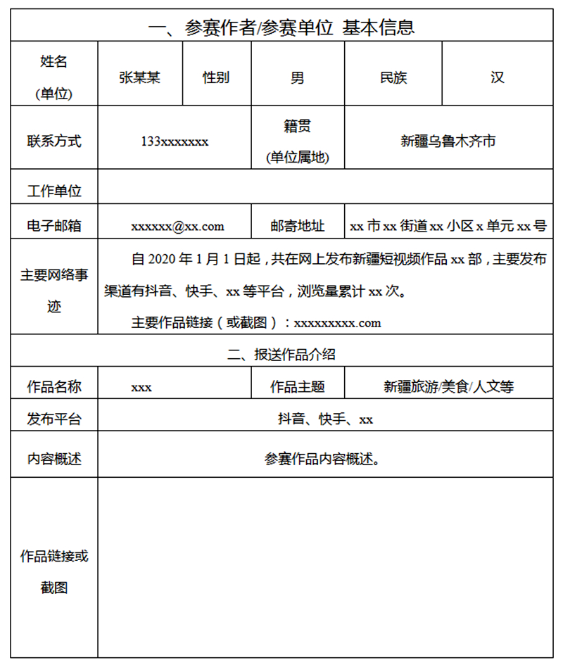 「萬人說新疆」短視頻大賽,徵集時間截至到2021年11月20日23時。具體報名渠道為:參賽作品統一命名為「作品標題+參賽作者或參賽單位+聯繫方式」,同時需另附相關文字說明材料(說明材料格式見申報模板)。上述材料請一併打包發送至指定郵箱xmtcbjs@163.com。