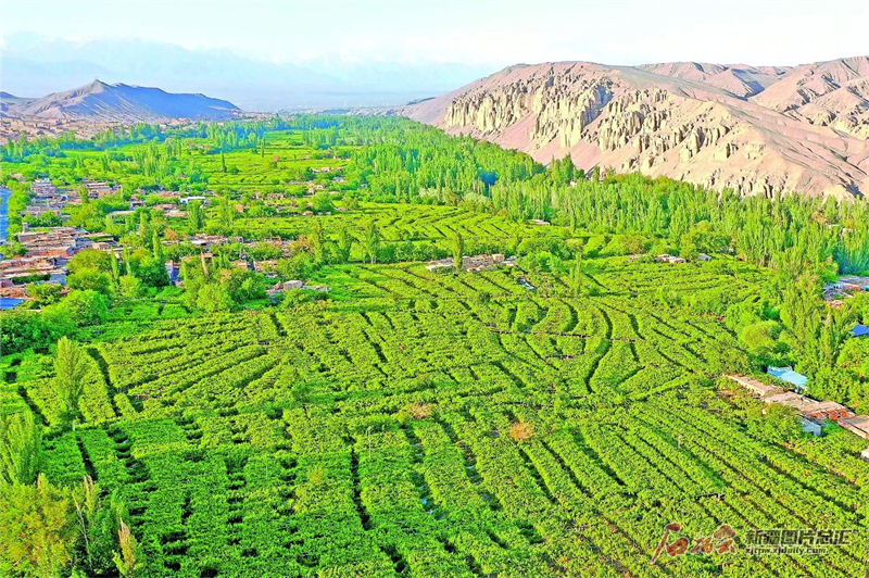 俯瞰吐魯番市高昌區葡萄溝景觀(4月26日無人機拍攝)。石榴雲/新疆日報記者 蔡增樂 攝
