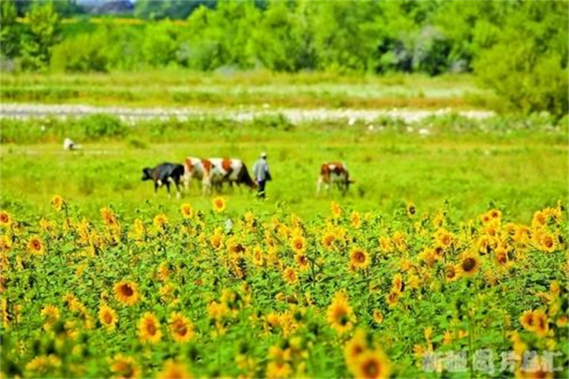 阿勒泰市紅墩鎮薩亞鐵熱克村向日葵地在夕陽下構成一幅美妙的鄉間畫卷。阿爾達克·拜斯汗 攝
