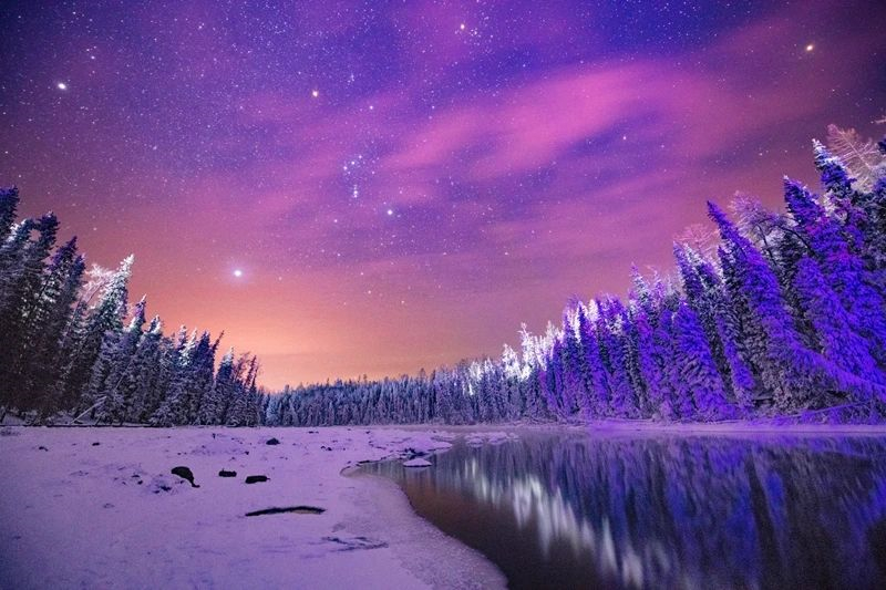 入夜時分,星光緩慢拂過喀納斯湖邊的樹梢,屬於喀納斯冬日的精彩盡在璀璨的夜空閃耀。邢千裏 攝