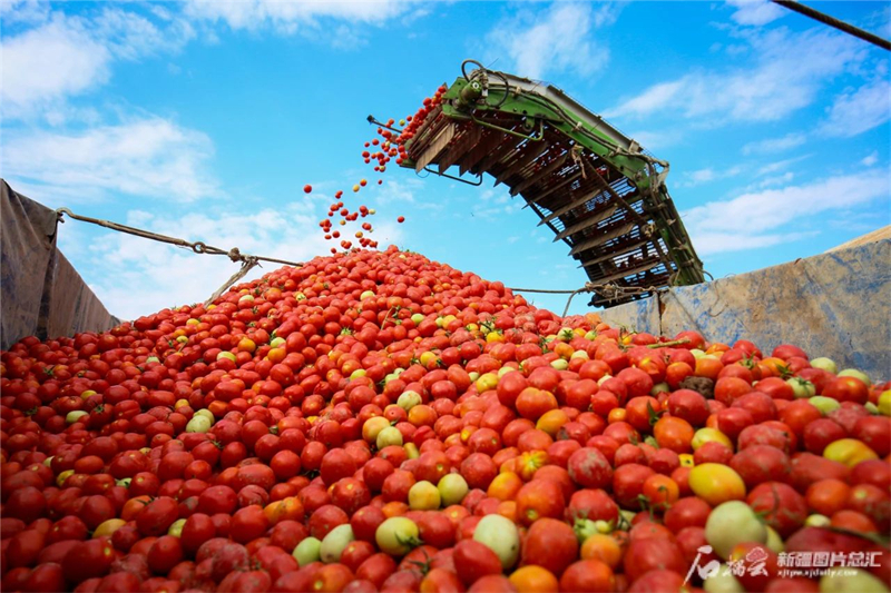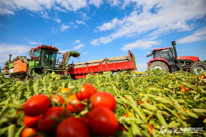在呼圖壁縣二十裏店鎮東灘村,村民正利用機械採收番茄。馬光元 攝