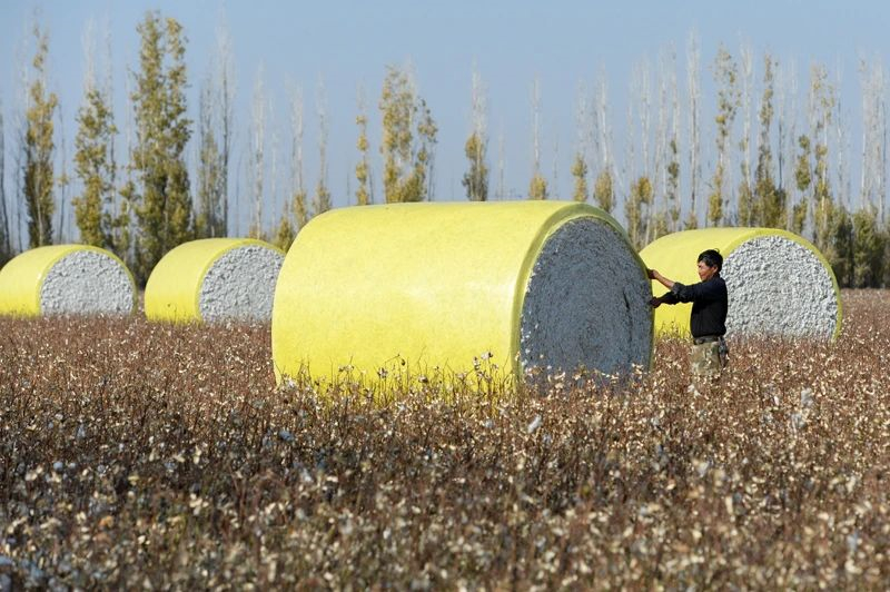 2020年10月17日,在瑪納斯縣樂土驛鎮文家莊村,棉農在查看採棉機自動打包好的棉花包。新華社記者 丁磊 攝