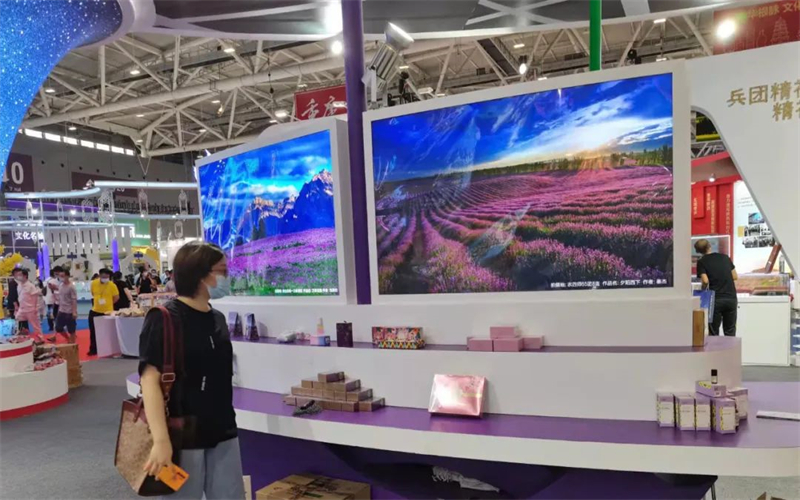兵團文創產品人氣很旺。國家4A級景區伊帕爾汗薰衣草觀光園為文博會營造了紫色的浪漫氛圍,展台上的薰衣草產品香氣四溢,此外還有「昆崗之花」民族手繪紋樣,阿拉爾印象·兵團紅都、艾兵艾團布偶娃娃、建設小兵團T恤……富有兵團特色的文化創意產品吸引了觀眾的目光。