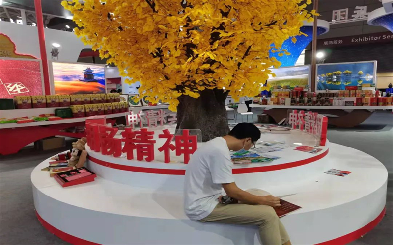 在展館的胡楊樹下,觀眾胡小元認真地翻看着一本介紹兵團歷史的畫冊。他說,展館很有個性,做設計工作的他喜歡歷史,很想了解兵團的歷史。在兵團出版社展架前,他認真翻閱起了架子上的圖書。