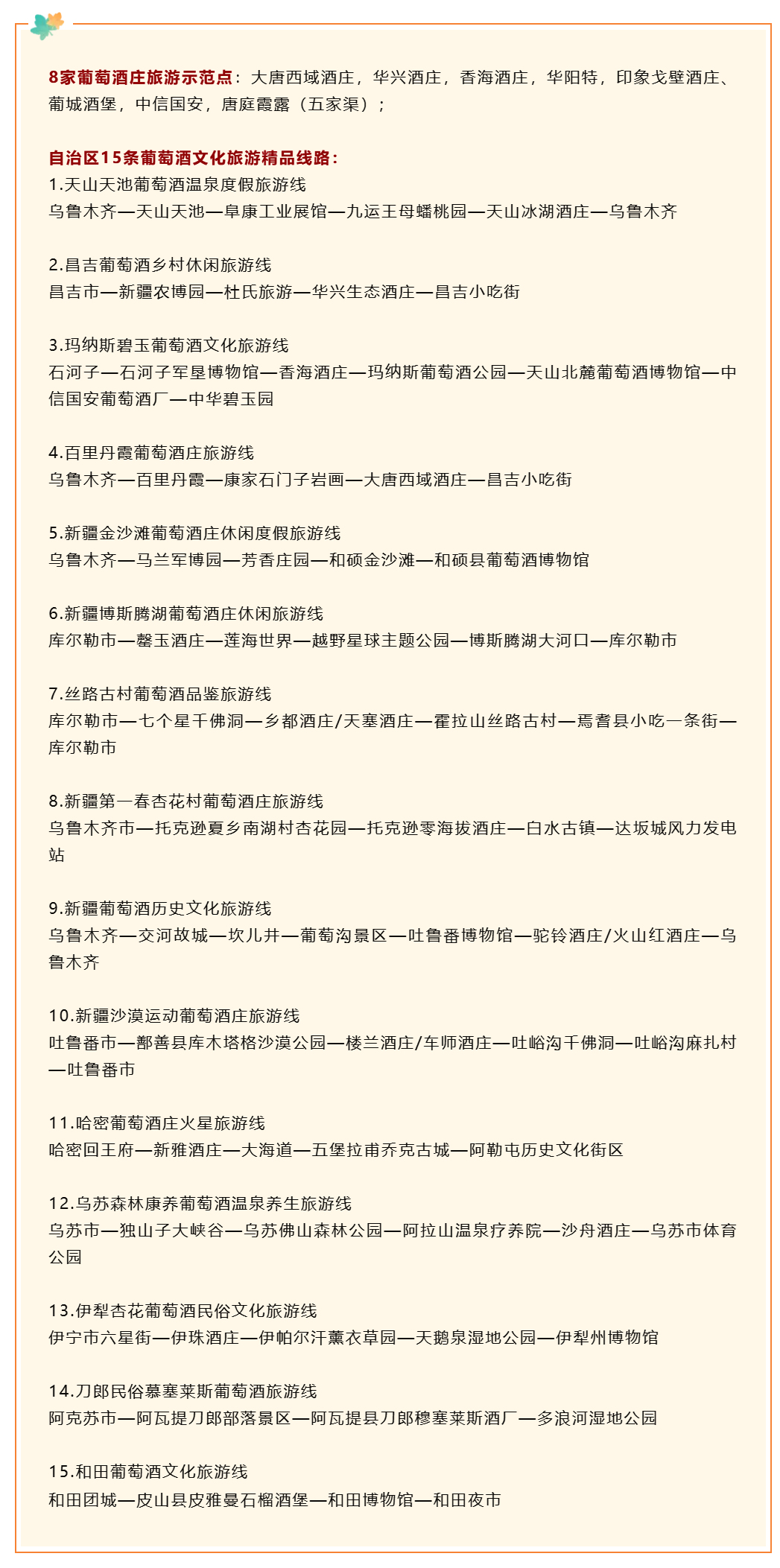 本次葡萄酒「文化之旅」分為A、B、C三條線路,將8家酒莊旅遊示範點與就近的昌吉州饢產業文旅小鎮、庭州生態綠谷、新疆農業博覽園菊花展、瑪納斯縣國家濕地公園、老龍河胡楊林等旅遊景區(點)融合,通過觀摩品鑒、文藝演出、文化研學、互動體驗等精彩活動增加遊客體驗性,通過遊客口碑進一步打響昌吉州酒莊旅遊知名度,同時提升葡萄酒產品附加值,也為昌吉州全域旅遊注入新的活力。