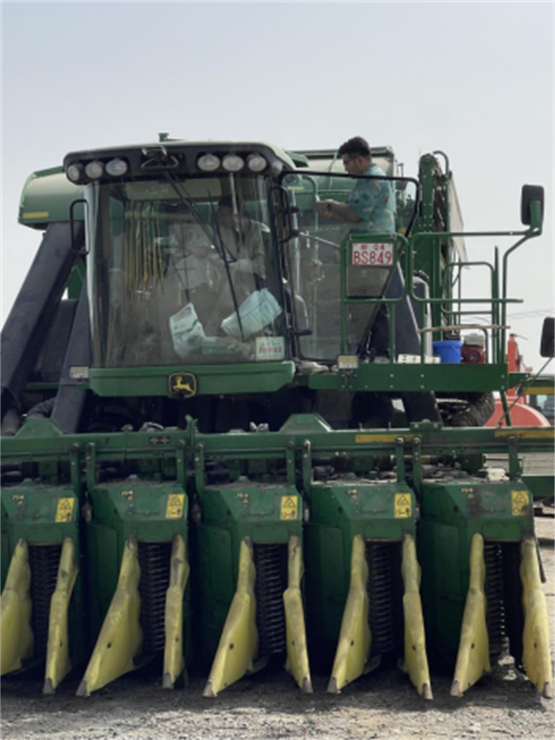 艾麥爾·吐爾洪調試採棉機為採摘做準備。