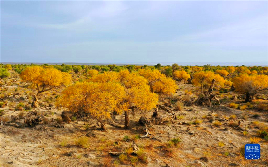 圖為10月1日的伊吾胡楊林景色。(無人機拍攝)新華社記者 沙達提攝