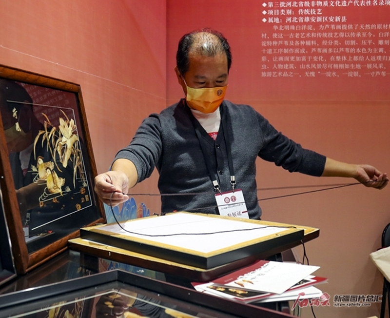 河北展區,非遺傳承人楊丙軍在擺放蘆葦畫。石榴雲/新疆日報記者 謝龍攝