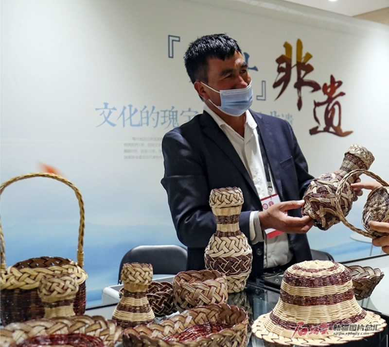 喀什展區,非遺傳承人玉蘇甫·卡依木展示自己編織的柳條作品。石榴雲/新疆日報記者 謝龍攝