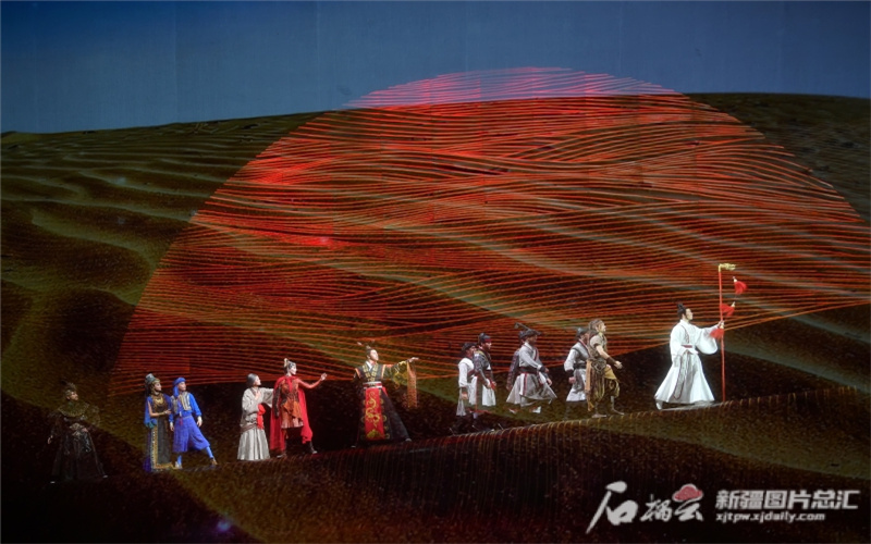 10月27日,大型原創舞劇《張騫》中,表現張騫出使西域、不辱使命,準備返回長安,受到西域各城邦人民追隨的場景。石榴雲新疆日報記者 鄒懿攝