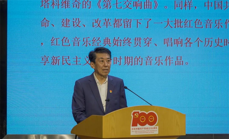 新疆美術館館長、二級巡視員王樹聲介紹了從《國際歌》到《紅旗頌》以及期間的一大批具有革命性的紅色音樂作品。這些作品如雄偉的畫卷,壯麗的史詩,藝術地記錄和展現了中國共產黨領導全國人民從黑暗走向光明,從勝利走向新的勝利的光輝歷程。重溫這些音樂經典,既是一種追憶,也是一種傳承和昭示。聆聽這些作品的過程,就是向思想深處不斷開掘、不斷升華的過程。從而感受到昂揚向上的精神力量,這種力量就是中國共產黨的紅色基因給我們的巨大精神財富和實現中華民族偉大復興中國夢的前行動力。