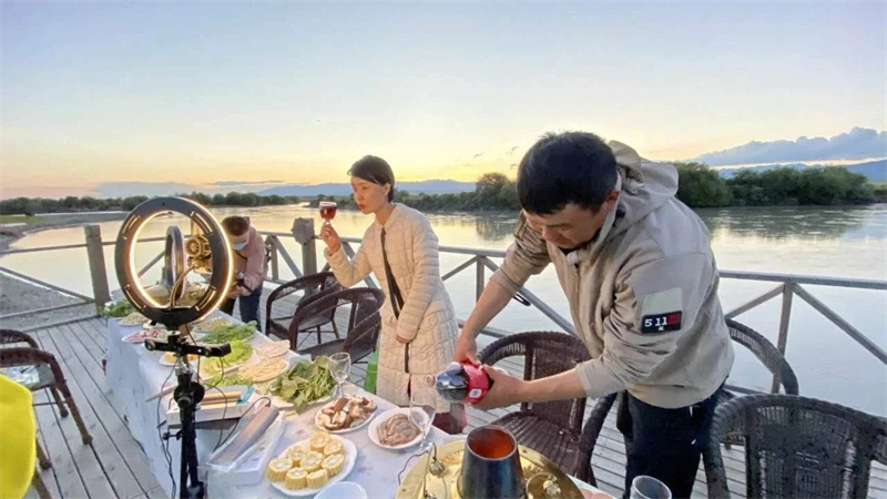 賀嬌龍在直播間為當地農產品帶貨(資料圖片)。圖片來源:伊犁零距離