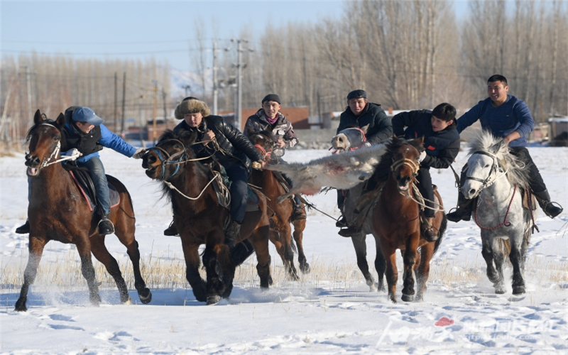 11月30日,牧民為遊客表演叼羊比賽。今年,阿勒泰市打造「騎行『黃金馬道』遊覽雪都美景」馬術旅遊產品,遊客下飛機後就可以立刻騎馬。石榴雲新疆日報記者 韓亮攝