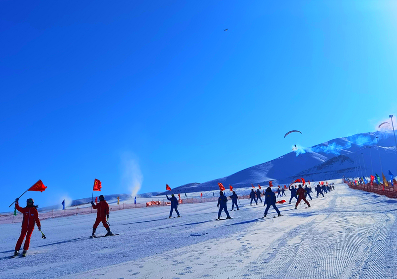 圖示:(西域努爾加滑雪場滑雪學校的教練們組成的滑雪方隊進行首滑儀式)