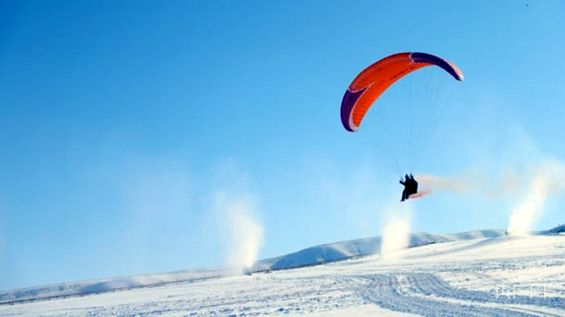 圖示:活動現場,滑翔傘愛好者飛翔在冰雪的世界。(素材來源:央廣網)