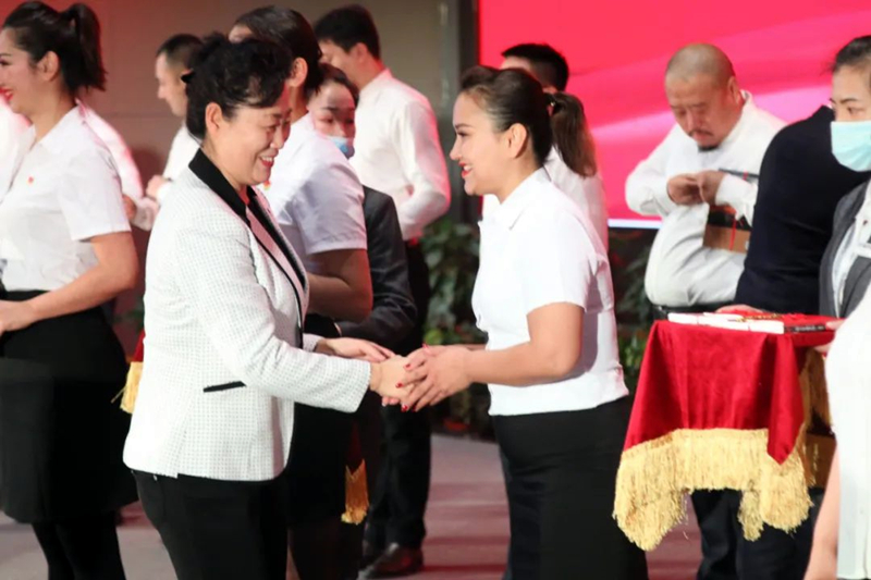 黨組書記侯漢敏為新發展黨員佩戴黨徽並贈送學習書籍
