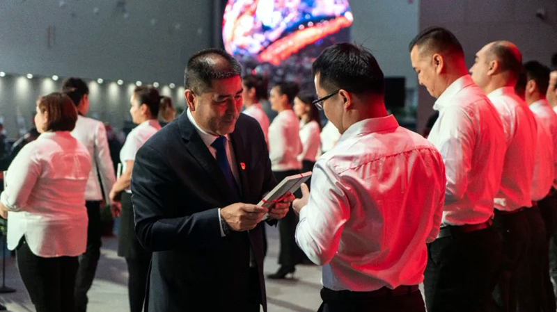 在主題黨日活動現場,侯漢敏和自治區文旅廳黨組副書記、廳長阿不力克木•艾則孜帶領黨組班子成員為12月份過「政治生日」的黨員贈送「政治生日」賀卡和學習書籍,為發展黨員佩戴黨徽,並帶領全體黨員進行入黨宣誓。