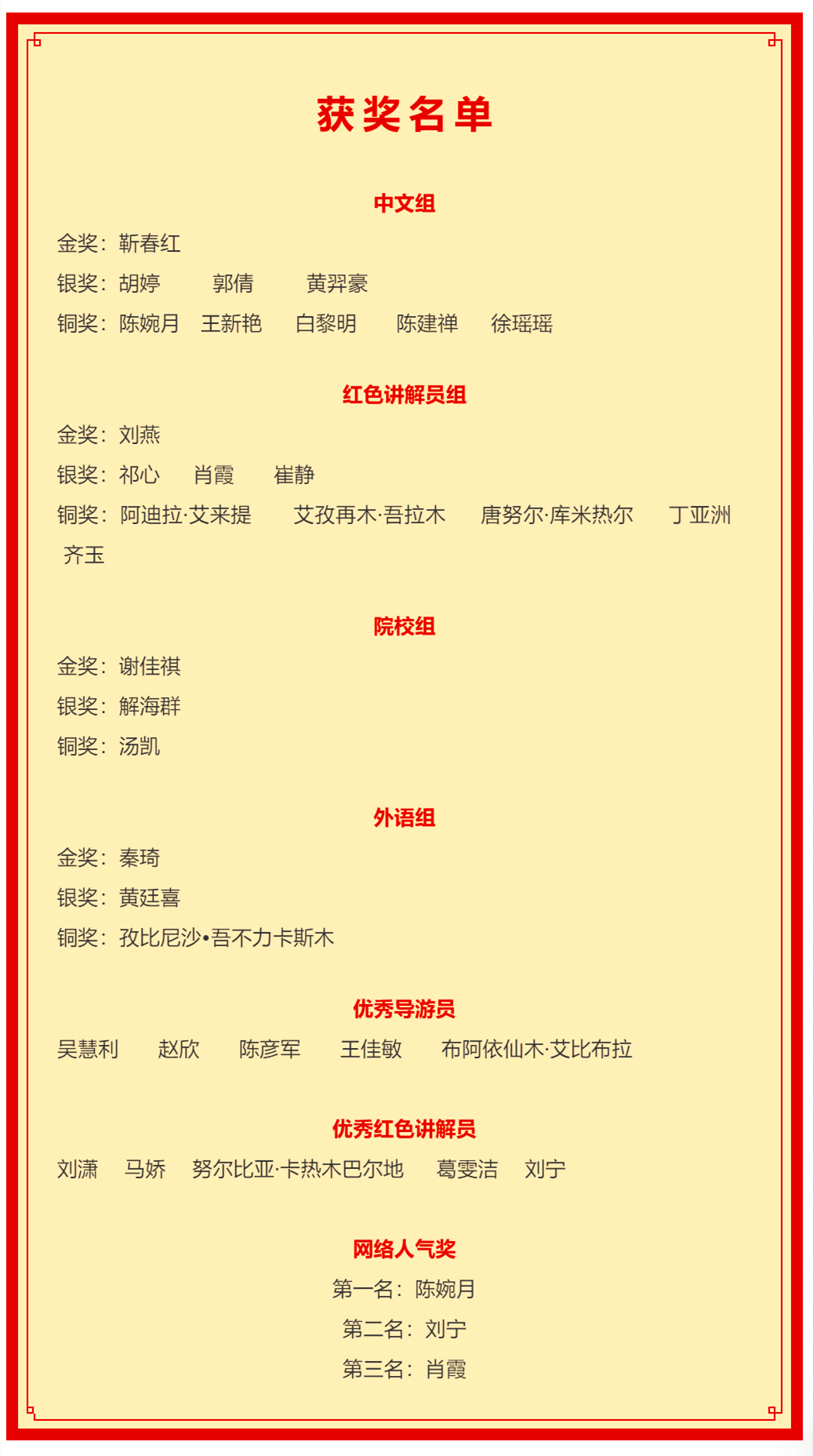 經過精彩的角逐,在41名晉級決賽的選手中評選出了金、銀、銅獎導遊員及其他獎項。
