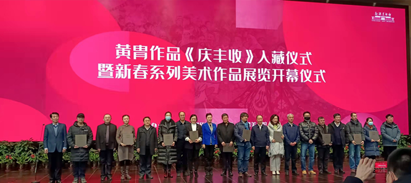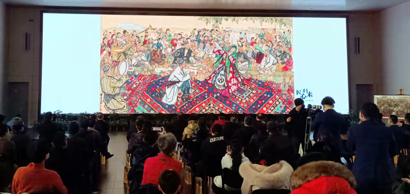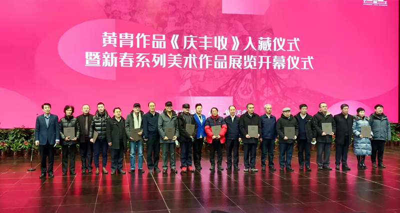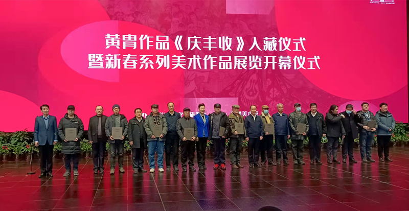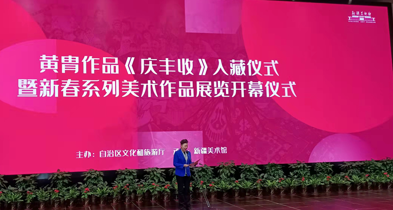 1月27日上午,由新疆維吾爾自治區文化和旅遊廳主辦,新疆美術館、新疆文化館承辦的黃胄畫作《慶豐收》入藏暨新春系列展覽在新疆美術館拉開序幕。