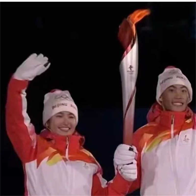 2月4日晚10時15分許,北京,國家體育場,第二十四屆冬季奧運會開幕式現場,來自人類滑雪起源地新疆阿勒泰的越野滑雪運動員迪妮格爾·衣拉木江和北歐兩項運動員趙嘉文,擔當最後一棒火炬手,將火炬置入主火炬雪花」中。