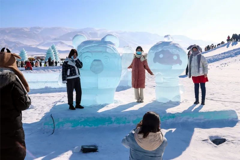 在賽裏木湖景區,遊客和北京冬奧會吉祥物冰雕合影留念。圖片來源:石榴雲/新疆日報 於蘇普·艾尼 攝