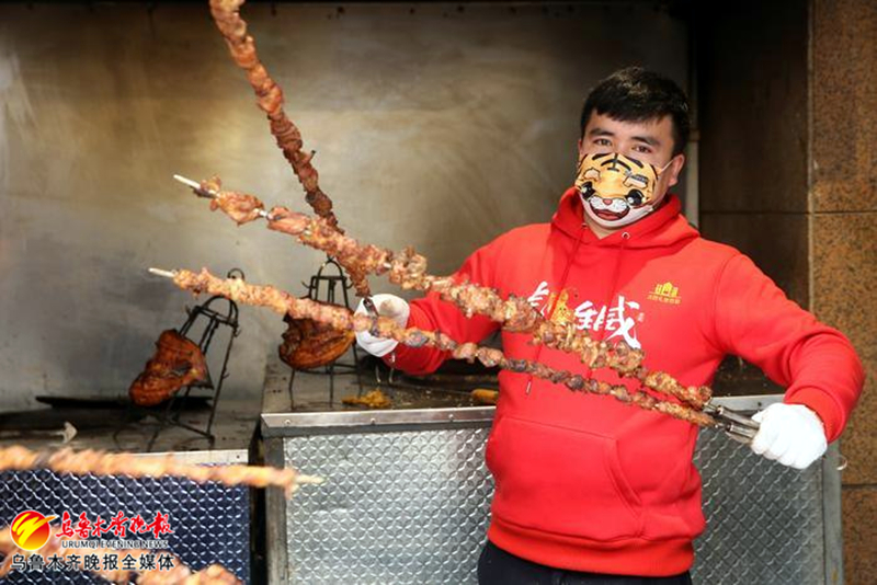 2月5日,烏魯木齊市第五屆天山區「廚香滿天山」冰雪美食大賽在大巴扎步行街啟幕。圖為參賽店家展示「大串烤肉」。圖片來源:烏魯木齊晚報