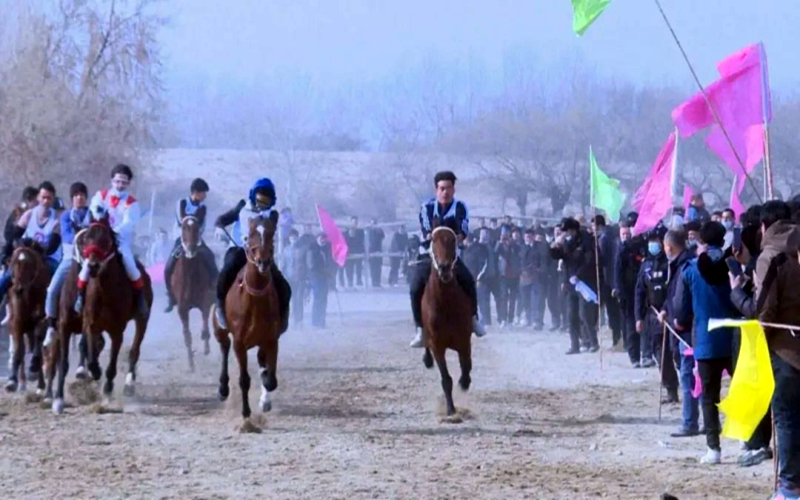 2月5日,在阿克蘇地區新和縣沙漠花海旅遊景區,一場馬背上激情與速度的視覺盛宴在這裏上演。在賽馬現場,隨着裁判一聲令下,選手們駕馭的賽馬如離弦之箭,一個個爭先恐後奔騰而過,一時間,賽場上馬蹄聲聲、塵土飛揚。前來觀賽遊客的歡呼聲、吶喊聲為現場增添了激烈熱鬧的氛圍。