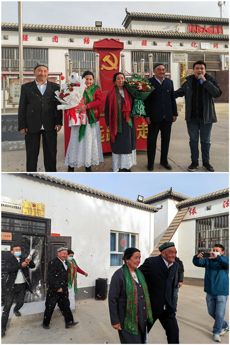 3月7日一大早,帕萬拉村村委會就擠滿了參加升旗儀式的群眾,婦女們都穿上最漂亮的新衣服,化上最美麗的妝容,一起迎接屬於她們的節日——「三·八」婦女節。升旗儀式結束後,工作隊和村「兩委」邀請了兩對和睦相處、相濡以沫的金婚、銀婚夫妻上台,為他們獻上鮮花,表達祝福,金婚家庭的阿西爾·阿皮孜夫婦激動和幸福的淚水從眼中流出,在全體村民面前暢談自己如何經營幸福婚姻、共度和諧生活的切身感受,台下的歡呼聲和掌聲延綿不斷,一幅和諧幸福的畫卷被勾勒的十分唯美,觸動着彼此,也感動着在場的每一個人。