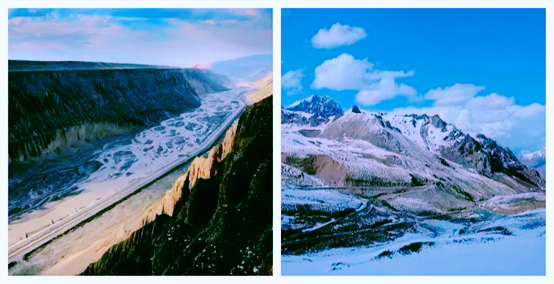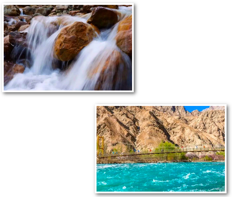 迎着崑崙雪山一路前行至泉水源頭,有難得一見的瀑布,瀑布落下山谷發出震耳欲聾的聲響,濺起的水花雲霧迷濛,洶湧澎湃。瀑布兩側懸崖陡立,峭壁岩石透着銹紅,有的岩石上有青色、黃色、紅色的苔蘚。