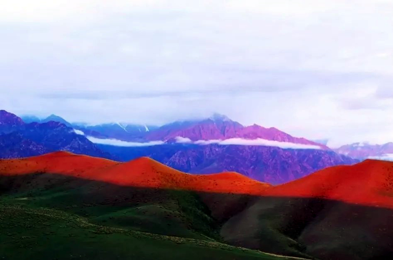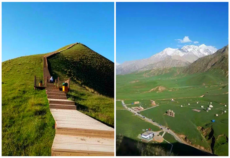 清晨,只見崑崙雪山近在咫尺,陽光照射在雪山頂上,倍感聖潔耀眼。雪山下面是綠綠的草原,草原上羊兒成群,馬兒四處奔跑,加上白色的蒙古包點綴其中,風景十分迷人。身在草原上周身舒暢,心情自然也明朗起來。一條木製棧道沿山而上,像條長龍盤旋在山上,登高望遠,風景如畫。