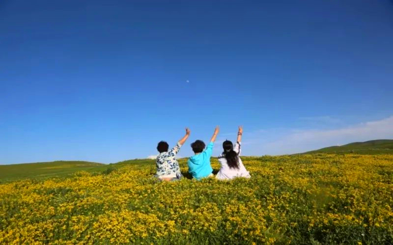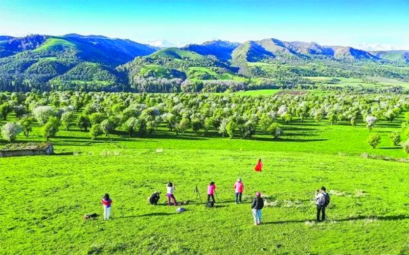 昭蘇縣天山腳下的巴勒克蘇大草原正是山花燦爛時,吸引踏春的遊人在此流連。圖片來源:昭蘇縣融媒體中心