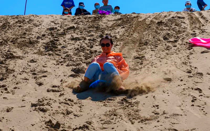 4月30日,在新疆精河木特塔爾國家沙漠公園,遊客體驗滑沙項目。圖片來源:石榴雲新疆日報 劉新佳 攝